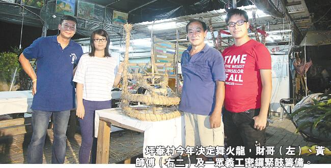 或許是與舞火龍的緣未盡,機緣巧合下,兩年前黃師傅受坪輋村村民財哥邀請,為一個準備參觀薄扶林村的臺灣導賞團做導遊。期間提到薄扶林村的傳統舞火龍,財哥靈機一動,「為何新界不可以舞火龍」?得悉黃師傅懂得紮作火龍,財哥邀請他在今年擔任導師,開班傳授紮火龍技巧,近來更為坪輋紮兩條火龍,並到安老院為老人家表演,村民更決定於中秋節晚在村內舞火龍。