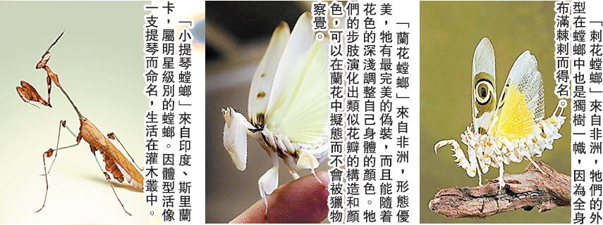 《世界稀品潮螳展》中最矚目的算是寵物螳螂界的3大天王:來自東南亞的「蘭花螳螂」、來自非洲的「刺花螳螂」和「大魔花螳螂」,牠們的外形奪目,當中蘭花螳螂更是偽裝界高手,其身體外形類似花瓣及可隨花卉調整顏色的技能,被譽為完美的偽裝者。而多種偽裝高手,就像另一屬產於坦桑尼亞及馬達加斯加的「幽靈螳螂」、產於印度及斯里蘭卡,活像一支小提琴的「小提琴螳螂」和世界上體型最大,產於坦桑尼亞的「瘤刺螳螂」(平均體長可達14至16厘米),還有其他罕有的明星級螳螂等都會一一展出,令人眼界大開。