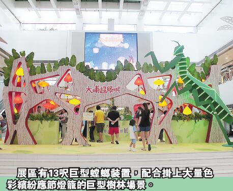 佔地1500呎的展區有13呎巨型螳螂裝置為布置亮點,配合掛上大量色彩繽紛應節燈籠的巨型樹林場景,倍添節日氣氛,讓顧客可以歡度別開生面的中秋節。