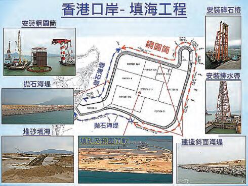 劉家強表示,機場人工島首次使用較環保的不浚挖式填海方法,分別透過拋石建造2.5公里海堤,及以85個直徑31米的巨型鋼圓筒直插并壓入海床的淤泥層至沉積層,直接圍繞填海範圍,毋須挖出海底淤泥,直接在圓鋼筒上填滿沙料穩固形成海堤,再以填沙及預壓荷載方法,建造面積達150公頃的人工島。