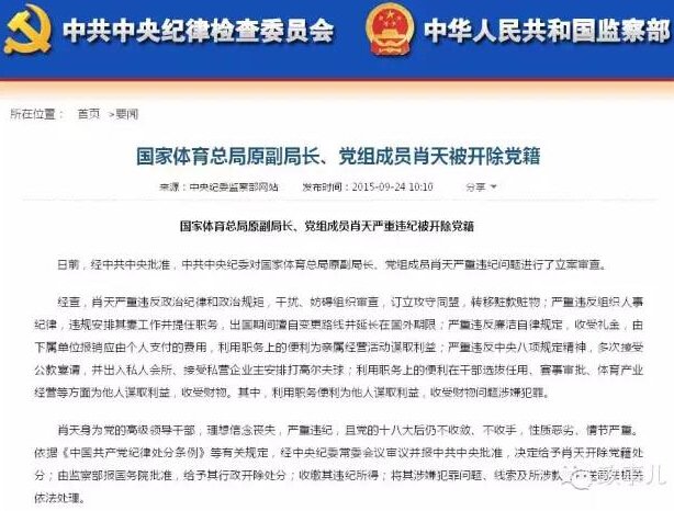 “政事兒”此前報道,知情人透露,6月25日上午10點多,肖天在一場會議中途休息的時候出去了,之后就沒再回來。不到3小時后,中紀委官網公布其落馬消息。肖天落馬后,也被稱為“體壇首虎”。