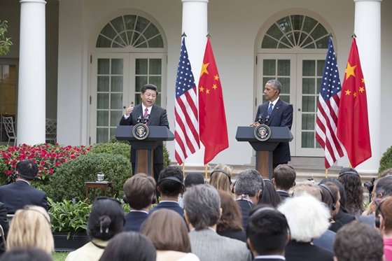 繼3小時「白宮夜會」後,兩國元首昨在白宮舉行會談。會談分小範圍和大範圍先後進行。小範圍會談地點設於白宮橢圓形辦公室,兩國元首先在壁爐前握手合影,並進行近一小時的會晤。接著,習近平和奧巴馬前往白宮內閣會議室,進行約30分鐘的大範圍會談。會談後,兩國元首在白宮玫瑰園共同會見記者。