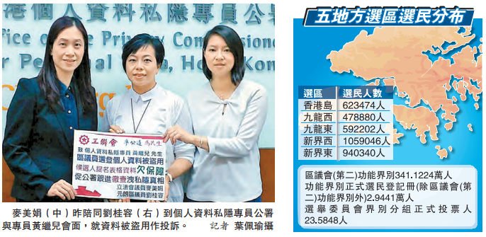 【香港商报讯】记者叶佩瑜、周伟立报道:选举事务处昨日公布2015年正式选民登记册,编制更新了约41.5万个地方选区选民的记录,共载有369万名选民,这批选民将可在11月举行的区议会一般选举投票。不过,工联会却发现有区议员选举资料被盗用,更甚至有被冒签,怀疑是处方疏漏惹祸,促请个人资料私隐专员公署跟进堵塞漏洞。