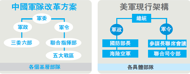 要向國際水平看齊,美國成為最合適的學習對象,是次改革方案主要參照美軍現行機制架構,也吸收了其它國家的長處,如以色列的作戰后勤保障,俄羅斯改革后的戰區設置等,再配合中國的具體情況。消息指,之前已出過一個快將公布的較為成熟的版本,后來上層領導看過后,認為和美軍等比起來,還有一段距離,又下令再作修改,於是一直拖到現在還沒有正式對外公開。