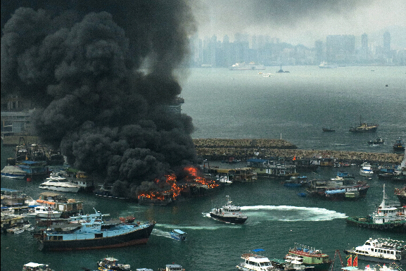 昨午2時許,上址海中突有船隻起火,火勢猛烈,迅速蔓延波及附近其他相連船隻,令大火一發不可收拾,滾滾濃煙直沖半空,火場更傳出多次爆炸巨響。消防處接報后,調派多艘消防輪到場射水灌救,惟因現場有多艘住家艇、漁船、蝦艇、駁船及中西式游艇均陷於火海,加上有著火斷纜的船隻隨水漂浮并撞向其他船隻,令火場範圍不斷擴大,更有人要棄船跳海逃生,消防遂於下午2時38分升為3級火警。