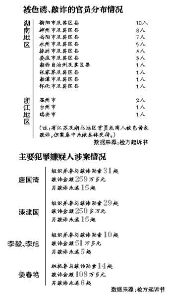 新京报记者获得的起诉书及警方调查信息显示,该案嫌疑人团伙共12人,6男6女,色诱或敲诈55人,涉案金额高达250多万元。涉及湖南衡阳、郴州等10个市、州,以及湖北、江苏、浙江三个省份,“大部分是官员。”一位接近衡阳政法系统的人士称。