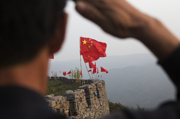 9月27日,国庆节将至,在河南巩义新中镇杨树沟的大山深处,一座悬崖绝壁的古长城上悬挂着66面国旗迎接国庆的到来。图为五星红旗迎风招展,当地村民向国旗致敬。据当地的民众介绍,这座建在悬崖峭壁上用石头垒起来的古长城是明清时期的军事要地,四面环山地势险要。