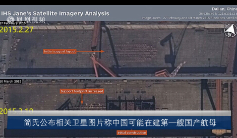 9月24日,全球权威的军事刊物《简氏防务周刊》网站,刊发了题为《中国可能正在建造第一艘国产航母》,并公布了大连造船厂2015年2月27日至9月22日之间的5张卫星图片,简氏防务周刊在这些卫星图片上标注了龙骨、分段等重要部位,并称,大连这艘无法确认的在建船体可能“成为”中国第一艘国产航母,文章还称,正在建设中这艘船舶使用的是用于解放军辽宁舰改装和修复的干船坞,虽然在没有观察到飞行甲板前无法确认这个船体就是航空母舰,但其较慢的建造进度、装配和轮廓表明这是一艘军用船舶的建造现场。