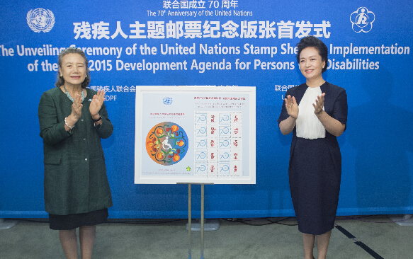 9月27日,国家主席习近平夫人彭丽媛在纽约出席残疾人主题邮票纪念版张首发式。彭丽媛同联合国秘书长潘基文夫人柳淳泽一道为纪念版张揭幕。