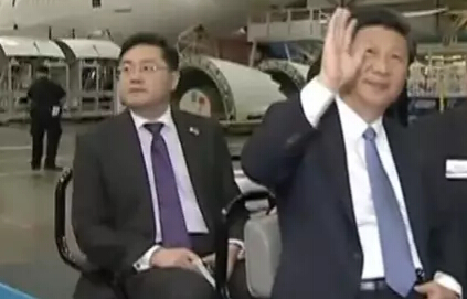 與上述“主席警衛”出現在波音公司廠房里的電瓶車上一樣,習近平身后的第三排坐著的就是秦剛。畫面顯示,秦剛坐在習主席后面,手拿一個紅色的筆記本狀東西。而在這之前,習近平抵達波音公司時,秦剛站在最前面為習近平介紹波音公司高層。