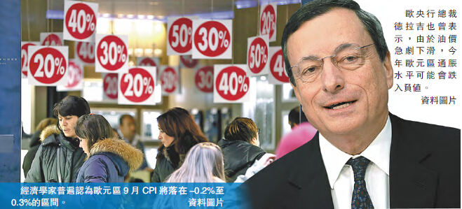 【香港商報網訊】在全球通縮陰霾籠罩之下,歐元區的通脹可能將跌至零。歐盟統計局將於本周三公布歐元區9月通脹數據,彭博社調查顯示,經濟學家普遍認為9月CPI將落在-0.2%至0.3%的區間,屆時數據的公布或將進一步加強市場關於歐洲央行加碼量化寬松(QE)的呼聲。歐央行總裁德拉吉也曾表示,由於油價急劇下滑,今年歐元區通脹水平可能會跌入負值。