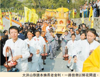 10時30分,恭迎本老舍利永久安奉祈福慶典舉行。印順大和尚致答謝辭時回顧了長老一生的修行,講述了長老辭親出家、參學悟道、刺血寫經、燃臂孝母、接法傳禪、恢復祖庭、在國家危難之際與祖國共命運等事蹟,表達了對一代宗師的無限敬仰。本煥長老於1907年在武漢新洲區出生,是中國佛教臨濟宗第44代傳人。其一生護國護教,肩挑如來家業,建寺安僧、振興祖庭,曾任中國佛教協會名譽會長,被譽為一代禪宗泰斗。2012年4月2日,本煥長老在深圳弘法寺示寂,世壽106歲,其舍利先后被泰國、蒙古等國寺廟及國內多座名寺恭迎供奉,祈福安康。據悉,作為中國歷史上禪宗的法脈聖地,隨州大洪山與本煥長老有著不解之緣。1930年2月,出家於武漢新洲報恩寺的本煥長老在武漢小洪山寶通禪寺學戒,并於佛誕日受具足戒。該禪寺與隨州大洪山「幽濟禪寺」一脈相承。2009年,本煥長老率衣缽弟子印順大和尚攜十方檀越發大願,重建大慈恩寺於大洪山之巔。長老圓寂前夕,仍念念不忘大洪山佛教發展,表示將自己的全部積蓄捐出為大眾做功德,其中1000萬元用於大洪山大慈恩寺建設。