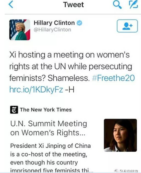 喜歡刨根問題的島叔終于翻到了希大媽的這番“粗鄙”言辭。在推特上,她寫道:“XI在聯合國主持婦女峰會,與此同時中國還在逮捕女權運動人士,簡直是毫無羞恥(shameless)”。