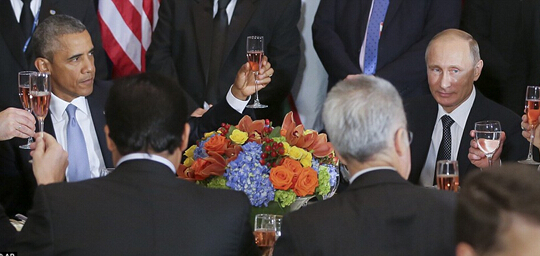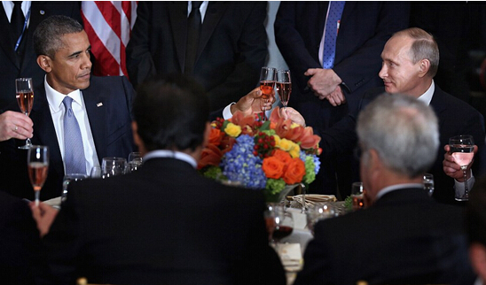 不过在随后的午餐时间,联合国秘书长潘基文发起祝酒时普京和奥巴马碰了碰酒杯。普京看上去心情不错,以他固有的微笑看着奥巴马,不过奥巴马就铁着脸,只是礼节性的举起了酒杯。
