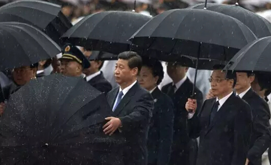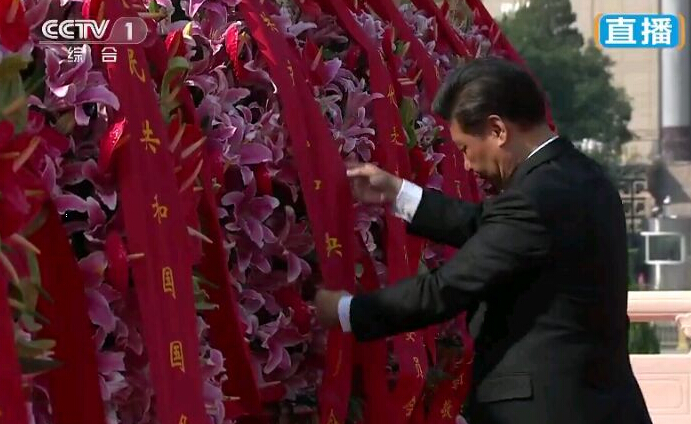 十八大后的第一个国庆,习近平、李克强、张德江、俞正声、刘云山、王岐山、张高丽等党和国家领导人于2013年10月1日10点前,冒着细雨步行来到天安门广场中央,出席向人民英雄纪念碑敬献花篮仪式。