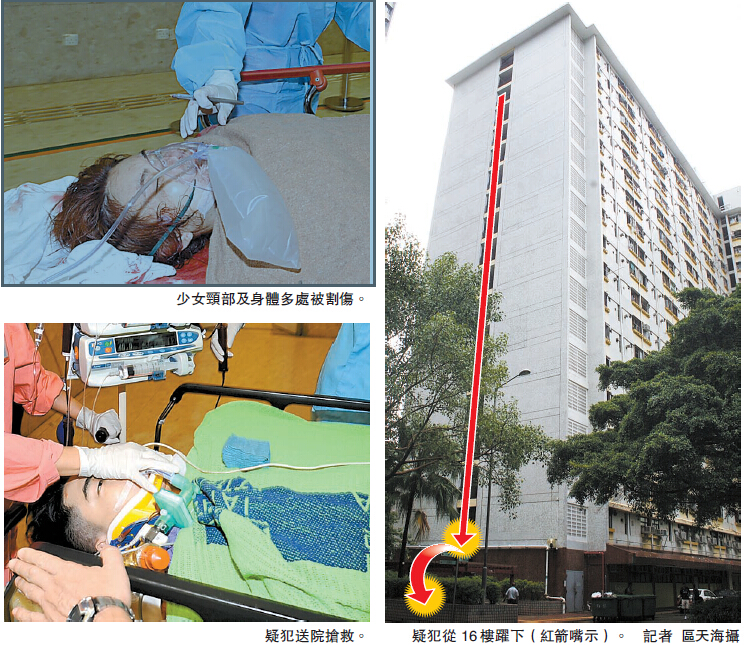 現場消息指,此時男兇徒拿出一把鎅刀,瘋狂襲擊對方頸部,大量鮮血四濺,場面恐怖,保安員一度阻止不果,兇徒將滿身鮮血少女押入電梯,登上16樓,懷疑有人驚覺犯下彌天大罪,不排除畏罪下跑到走廊盡頭,攀越約4尺高鐵欄一躍而下。