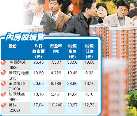 從大摩列出各內房商在內地限購令城市資產價值占比中發現,在內房龍頭中,中海外(688)及世茂房地產(813)在限購令城市的資產占比相對較小,分別為19%與12%。