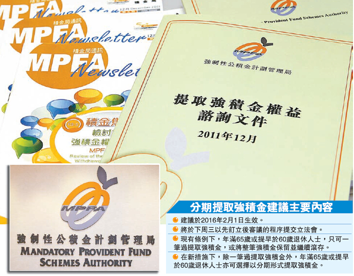 根據現有條例,年滿65歲或提早於60歲退休人士,只可一筆過提取強積金,或將整筆強積金保留并繼續滾存。在新措施下,除一筆過提取強積金外,這些計劃成員亦可選擇以分期形式提取強積金。受託人除必須交易費用外,不得就整筆支付或該年首4期的分期支付的強積金,向計劃成員收取費用或施加罰款,也不能從該成員的帳戶扣取費用。《生效日期公告》將於下周三以先訂立后審議的程序提交立法會。