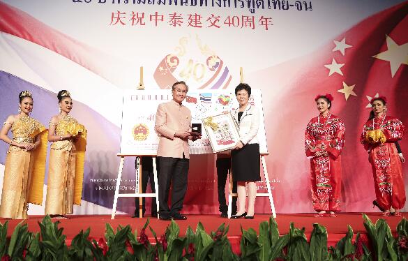 圖為全國人大常委會委員長嚴?琪向泰國外交部長敦·帕馬威奈贈送中泰建交40周年紀念郵品。中新社發 熊然 攝