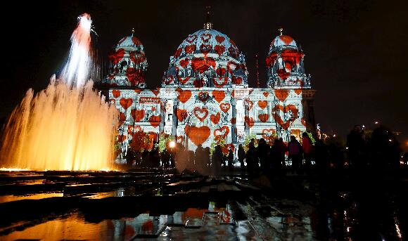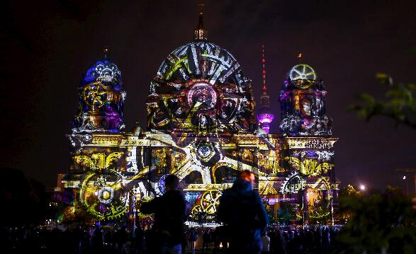 10月9日,在德國柏林燈光節上,人們觀看柏林大教堂外墻上的燈光秀。新華社/路透