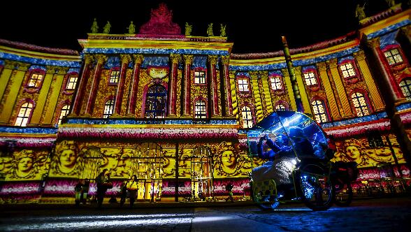 10月9日,在德國柏林燈光節上,人們觀看老皇家圖書館外墻上的燈光秀。新華社/路透