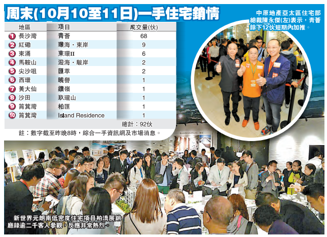 【香港商報網訊】記者鄭達偉報道:在缺乏大型焦點新盤開售下,市區單棟住宅項目成為支撐過去周末(10月10日至11日)一手交投的主力。據一手物業銷售網及市場消息顯示,截至昨晚8時,過去周末兩日一手市場共錄92宗成交,惟當中68伙均來自長沙灣單棟新盤「青薈」,占總成交量約74%,相對而言,其他新盤成交則相對冷清。