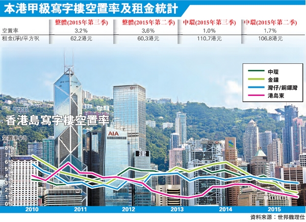 世邦魏理仕昨日發表的香港寫字樓市場研究報告顯示,本港整體甲級寫字樓的空置率已由第二季的3.6%進一步跌至上季的3.2%,當中中環區的甲廈空置率更跌至只有1%,逼近2008年0.8%的歷史水平,港島區方面,甲廈空置率雖仍能企穩2%的水平,惟仍較次季下跌了接近0.6%。