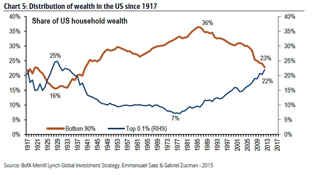 以下美銀美林的1917年以來美國家庭財富分配圖表顯示,近三十年來,占人口90%的美國底層家庭擁有的總體財富在全國所占比例直線下滑,從36%降至23%,而占人口0.1%的最富有家庭財富占比自上世紀70年代起就一直增加,已經升至22%。