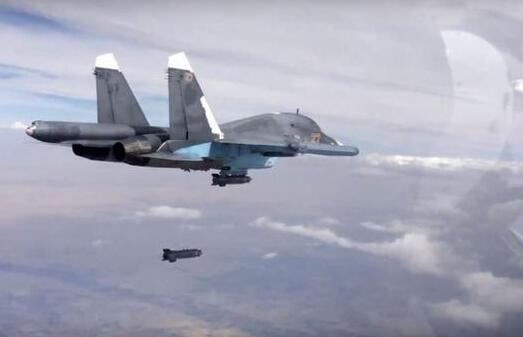 資料圖:一架俄軍蘇-34戰機正在敘利亞上空投彈(2015年10月9日)