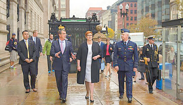 美國國防部長卡特(前左一)與澳洲國防部長佩恩(前左二)一起步行前往波士頓公共圖書館。