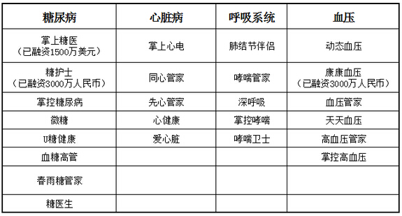一財網梳理結果顯示,目前糖尿病、心臟病、呼吸系統、高血壓、高血脂、男科泌尿系統、腰椎疾病、齒科等領域均有大量醫療管理類APP產品,其中尤以糖尿病、高血壓類居多,部分APP產品搜索結果如下: