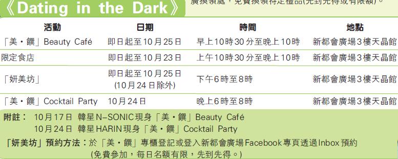 今年的《Dating in the Dark》年度盛事於商場3樓天晶館舉行,場地布置大玩後現代工業loft風,配搭raw味十足的貨櫃設計及木質桌椅,營造簡約時尚的休閒空間。為配合今年活動的特色元素,新都會廣場於場內特設全港首間「美·饌」Beauty Cafe,推出各式韓式養顏甜點及新派fusion韓食;並邀得韓國人氣偶像組合N-SONIC、MYNAME及韓國唱作女歌手HARIN到場與一眾粉絲見面。深明時尚一族對「內」在美以及外在美的追求,同場亦有城中多間人氣飲食新貴限時發售的健康「營」食;更特設至潮彩妝部落「妍美坊」,由駐場專業化妝達人免費為一眾愛美女生化出大熱專屬美妝,令她們瞬間由內靚到外。