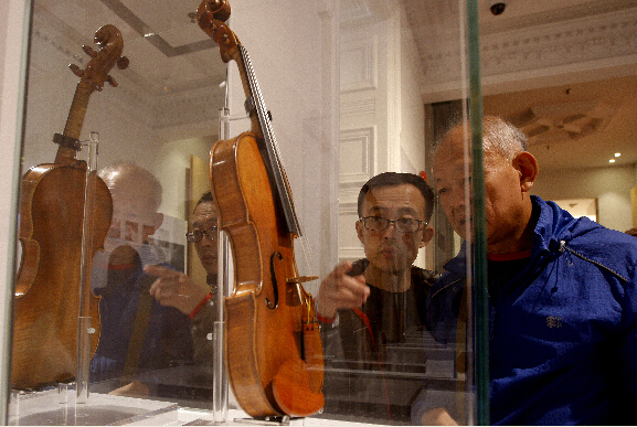 觀眾觀看在櫥窗里展示的小提琴。