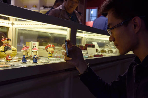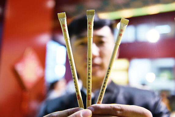 故宮博物院工作人員在展會現場展示“金榜題名”環保筆。