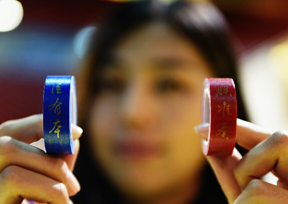 故宮博物院工作人員在展會現場展示寫有“朕準奏”和“臣有本”的創意膠帶。