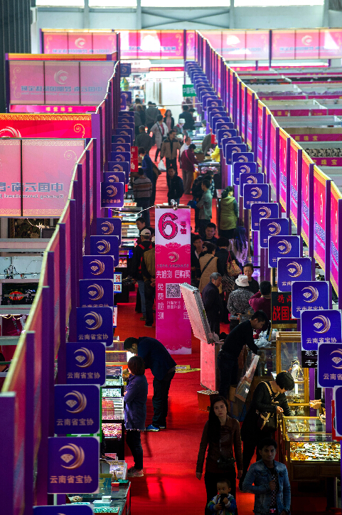 消費者在第五屆昆明國際珠寶展上參觀、選購商品。