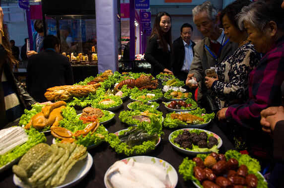 觀眾在第五屆昆明國際珠寶展上參觀用玉石雕刻的“菜品”。