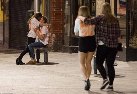 一對男女在市中心的長凳上進行親密接觸。
