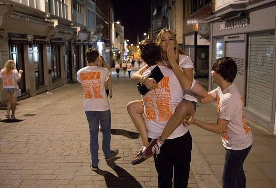 學生戴上動物組織和橙色t恤,標志自己動物本能一部分。該活動今年在英國36個城市舉行。這些狂歡作樂的年輕人不顧刺骨的寒風,女子穿著緊身短褲和內衣外露的T恤。成群男子則沿著街邊一路跌跌撞撞,大喊大叫。