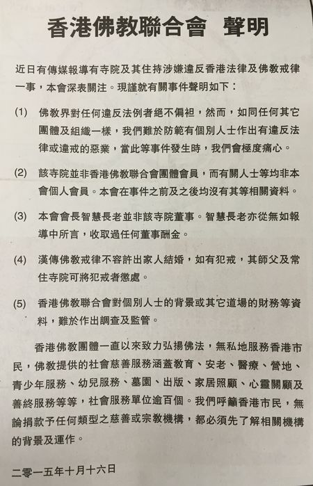 佛聯會今天刊登報章的聲明指出,定慧寺並非佛聯會會員,事件涉及的有關人士均非該會個人會員,該會在事件之前及之後均沒有他們相關資料。聲明又澄清,該會會長釋智慧並非定慧寺董事,亦從無收取過任何董事酬金。而佛聯會對個別人士的背景或其他道場的財務等資料,難於作出調查及監管。