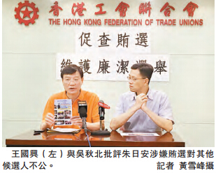 工联会昨午举行记者会,回应朱日安涉嫌贿选一事。王国兴表示,作为候选人之一,希望选举可以公平、公开地进行,对於朱日安涉嫌以「爱心饭盒」作招徕,他予以批评,认为有关行为或涉及延后利益输送问题,「暗示曾经拿过饭的街坊,要以选票回报他」,促请执法部门彻查事件。他续称,「派饭」事件涉及柴湾区街坊福利会惜食堂两个团体,质疑有关团体是否知悉对方以此作为宣传手段,认为有关部门应查明真相,工联会亦会采取适当方式作出跟进。