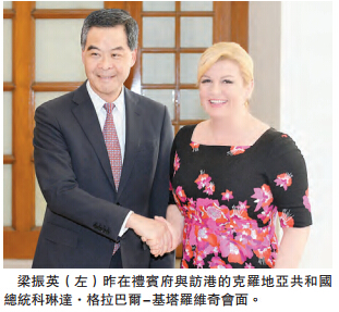 【香港商报网讯】行政长官梁振英(CY)昨日上午在礼宾府与访港的克罗地亚共和国总统科琳达-格拉巴尔-基塔罗维奇会面,就双方共同关心的课题交换意见。