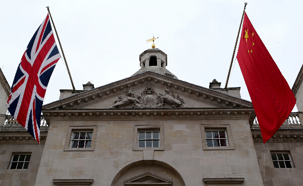 10月17日,在英国伦敦,中、英两国国旗悬挂在皇家卫队阅兵场。新华社