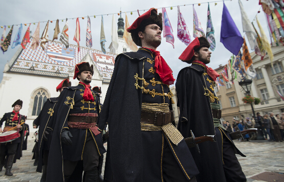 10月18日,来自克罗地亚“领带军团”的士兵系着传统领巾在首都萨格勒布圣马可广场参加“领带日”庆祝活动。