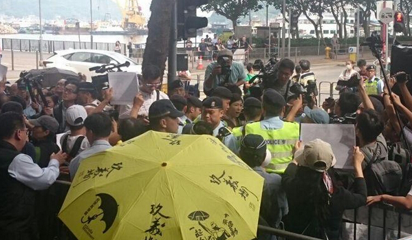 另外,亦有人持「原告变被告」的示威纸牌。法庭内外均有警员戒备。