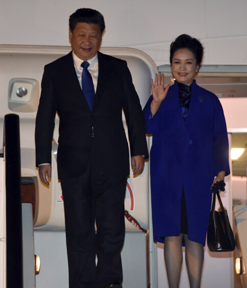 习近平与夫人彭丽媛走下舷梯。路透社