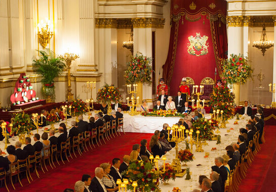 此次國宴地點是在白金漢宮的宴會廳,長36.6米、寬18米、高13.5米,是白金漢宮最大的房間。