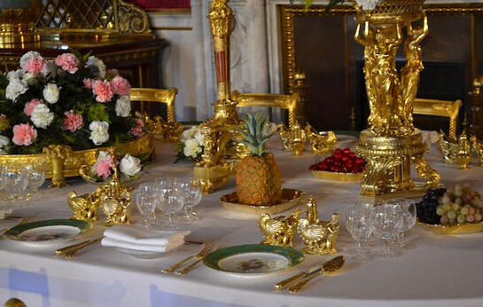 國宴當天,白金漢宮宴會廳會在大長條桌上擺滿金碧輝煌的餐具,每套餐具間必須精確相差46厘米,即使最熟練的侍從也要依靠有毫米刻度的尺子來給每套餐具定位,準備一場國宴要花費約10天。
