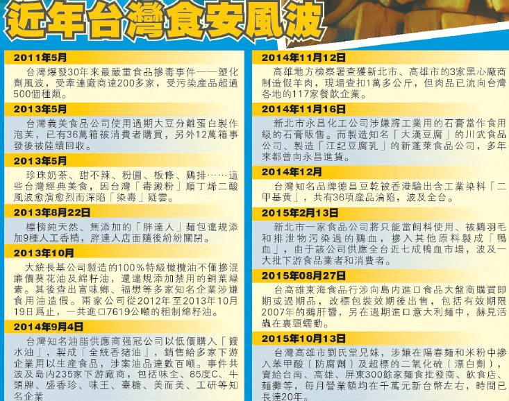 近年來,臺灣食品安全一路亮著紅燈,食品安全問題層出不窮,據不完全統計,僅2014年至今,臺灣大大小小的食品安全問題至少已發生10起之多。在臺灣2014年「票選年度第一大新聞事件」,「食安風暴餿油流竄」囊括三分之一得票數,「蟬聯」冠軍,加上年度代表字「黑」,反映2014年是全民「食」在不安的一年,臺灣的食品安全問題令人擔憂。