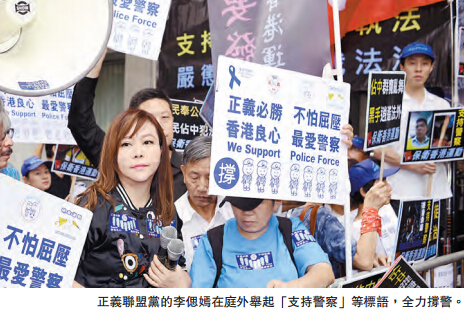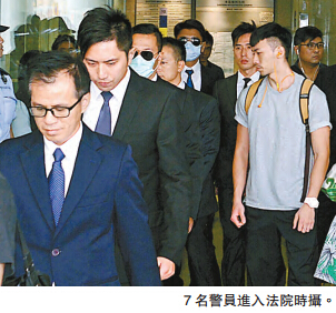 另外,法庭於下午2时半首先处理「7警」案,7名警员:依次为有组织罪案及三合会调查科总督察黄祖成(48岁)、观塘反黑组主管高级督察刘卓毅(29岁)、观塘反黑组侦缉警长白荣斌(42岁)、观塘反黑组警员刘兴沛(38岁)、东九龙刑事总部侦缉警员陈少丹(31岁)、九龙城刑事侦缉警员关嘉豪(33岁)及观塘反黑组侦缉警员黄伟豪(36岁),他们於下午2时正穿着整齐西装,列队由正门进入法院大楼。其中刘兴沛、陈少丹及黄伟豪均戴上墨镜及口罩。